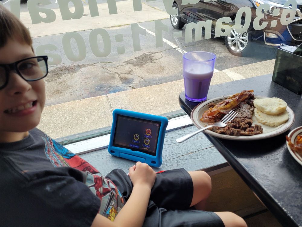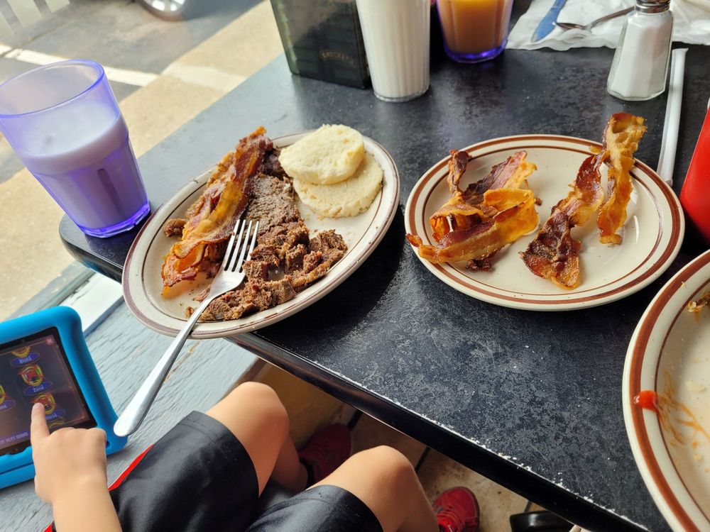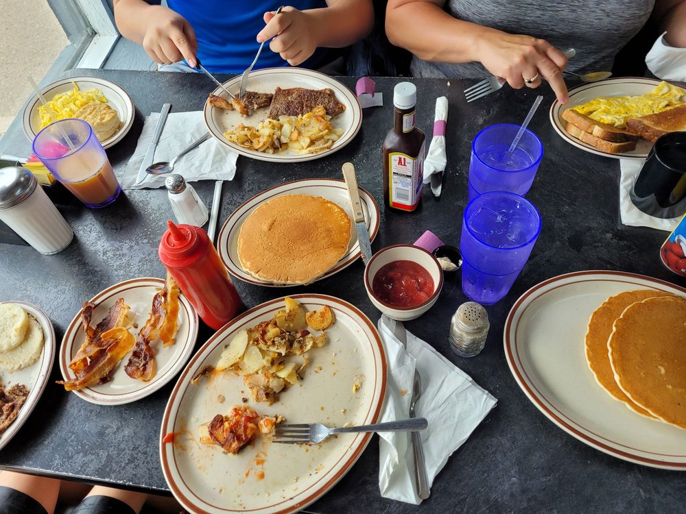 2 pancakes or 2 french toasts and your choice of meat (links, patties or bacon), served with 2 eggs