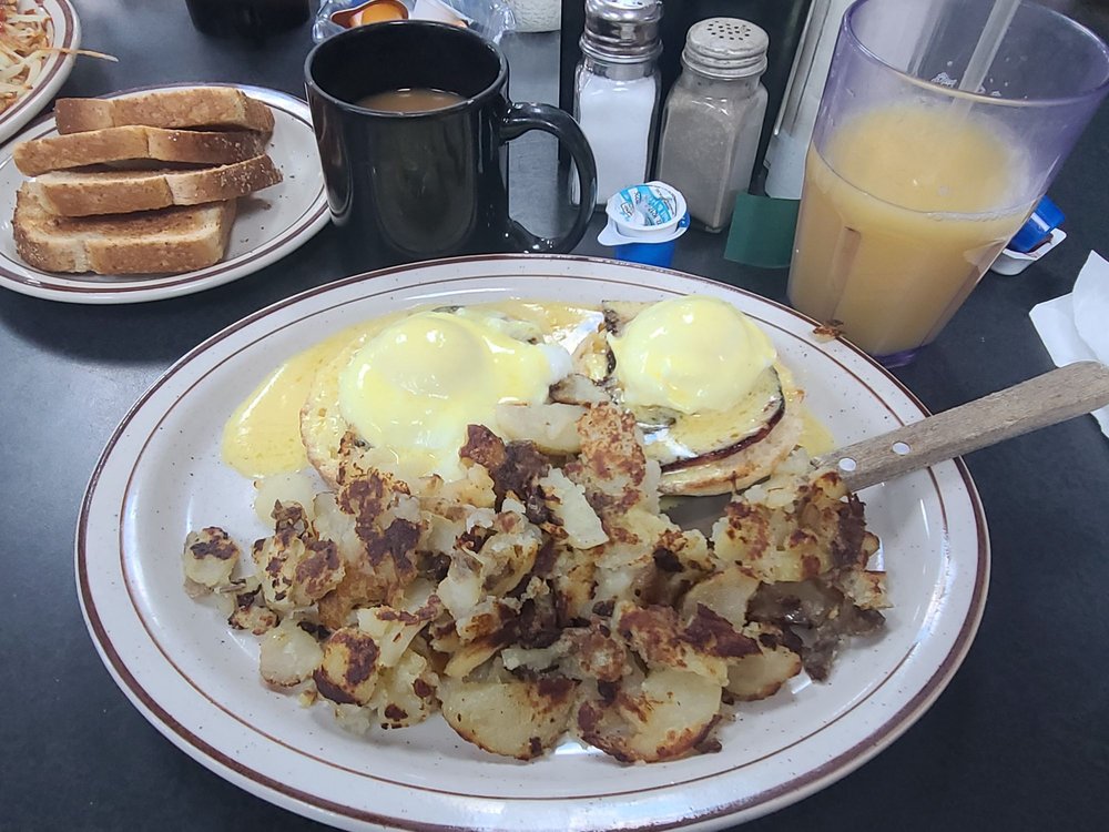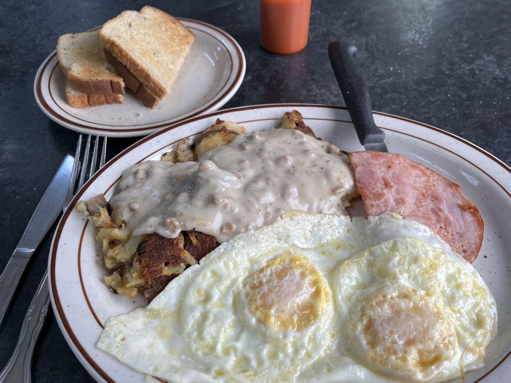 2 eggs, bacon or links & potatoes. Topped w/ sausage gravy. Served w/ toast